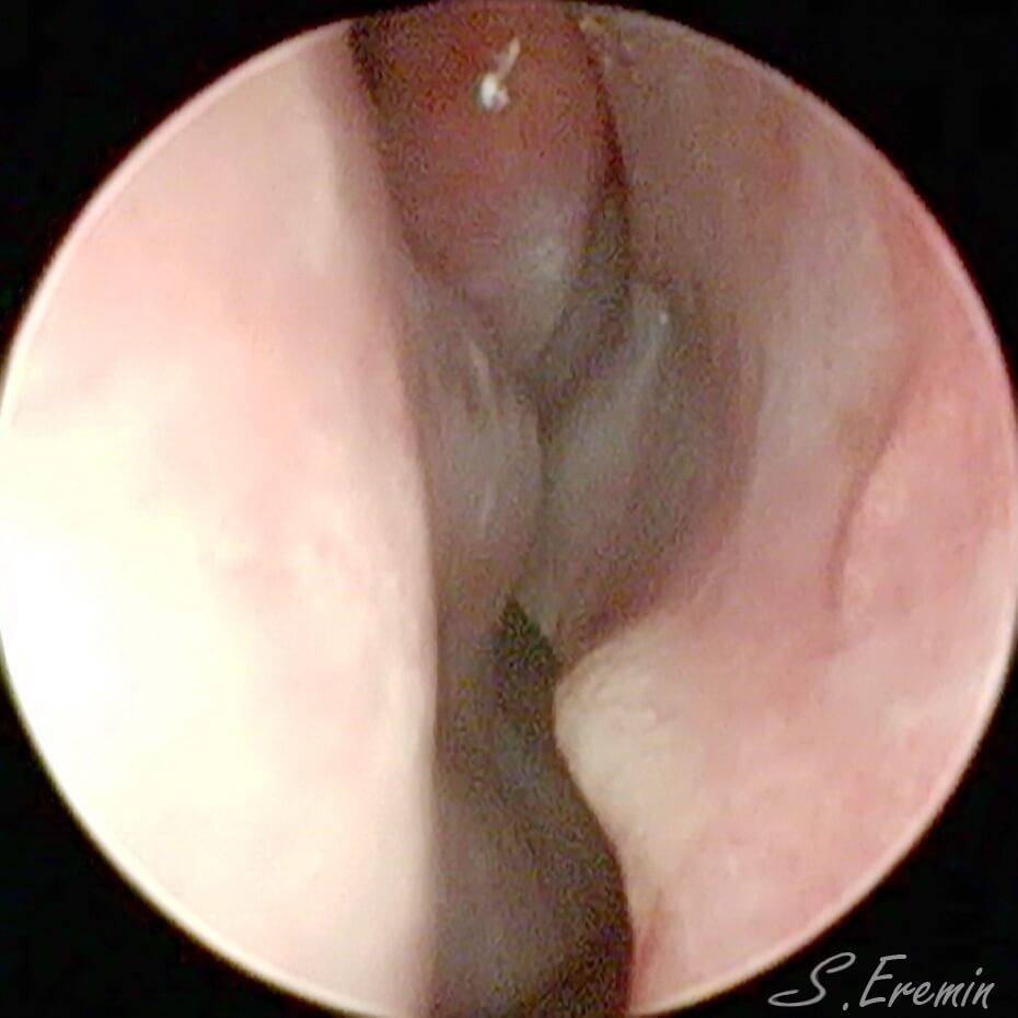 Вход в нос сужен искривлением перегородки так сильно, что нельзя пройти эндоскопом