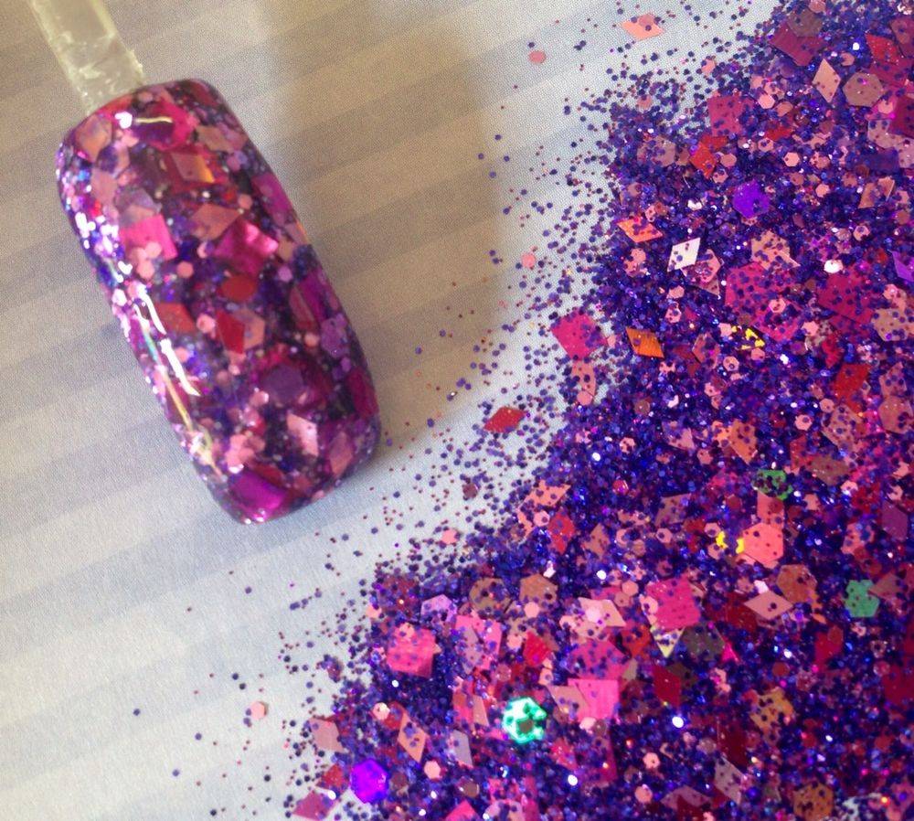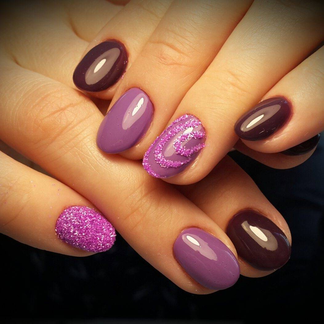 Еще один фиолетовый маникюр с блестками, ведь блеска много не бывает.
