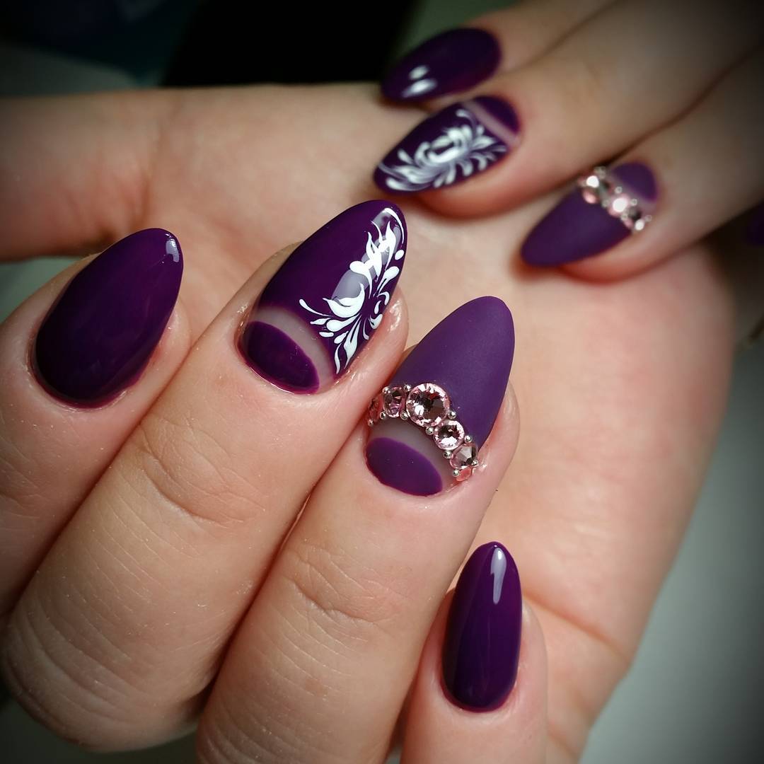 Поэкспериментируй с оттенками. Лавандовый, сиреневый и баклажановый, дополненные паутинкой из линий и стразами – идея для любого случая.