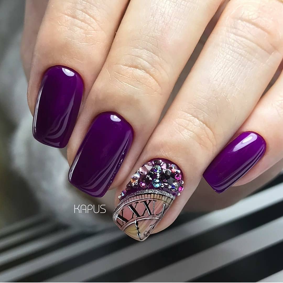 Темно-фиолетовый маникюр, разбавленный глиттером в тон, подойдет и для торжества, и для офиса.