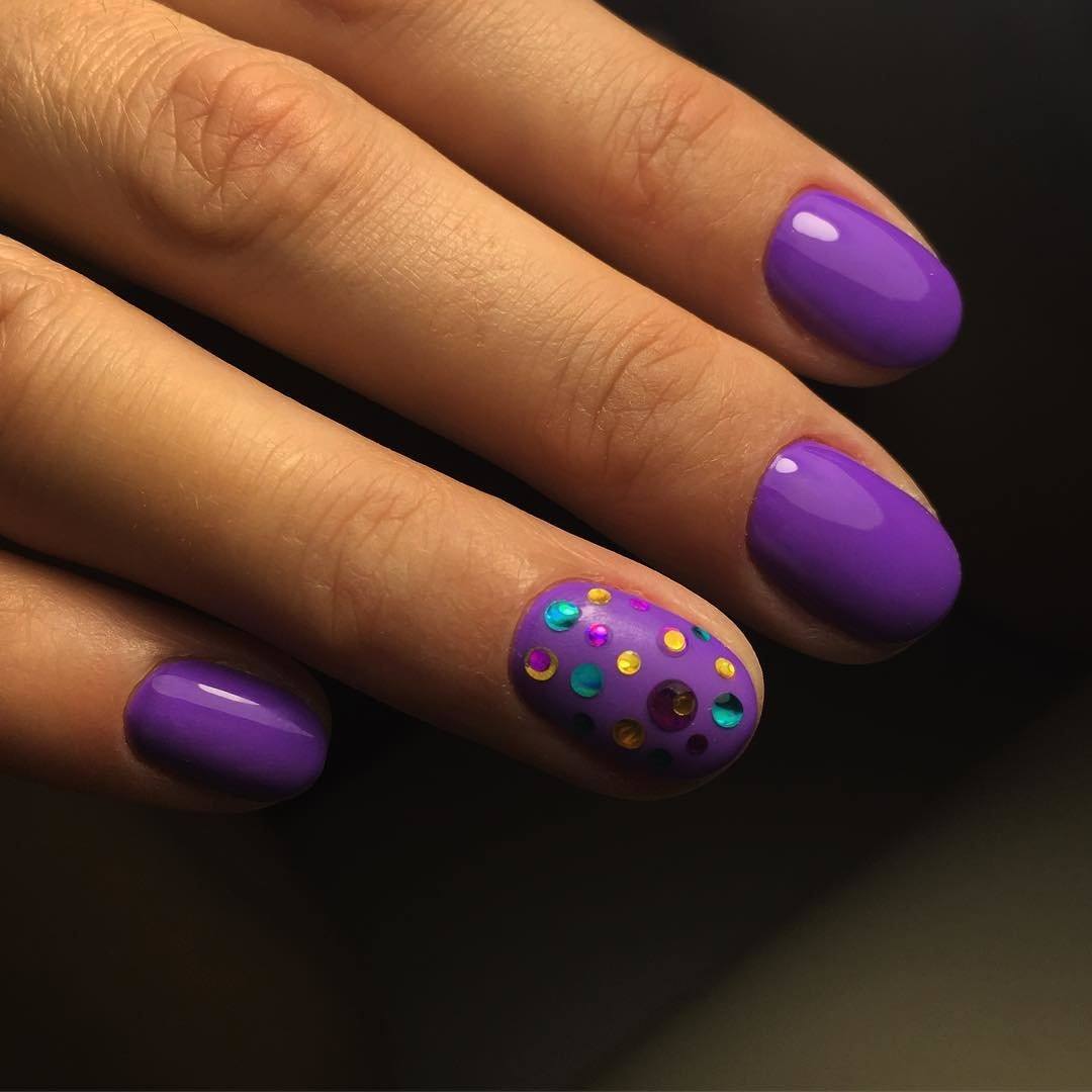 Кроме этого, нередко ноготь покрывают гель-лаком фиолетового цвета и подмешивают туда множество разноцветных блесток. Или берут уже готовый лак с глиттером – так называемый “мокрый”. Таким образом получается насыщенный, оригинальный и интересный цвет.