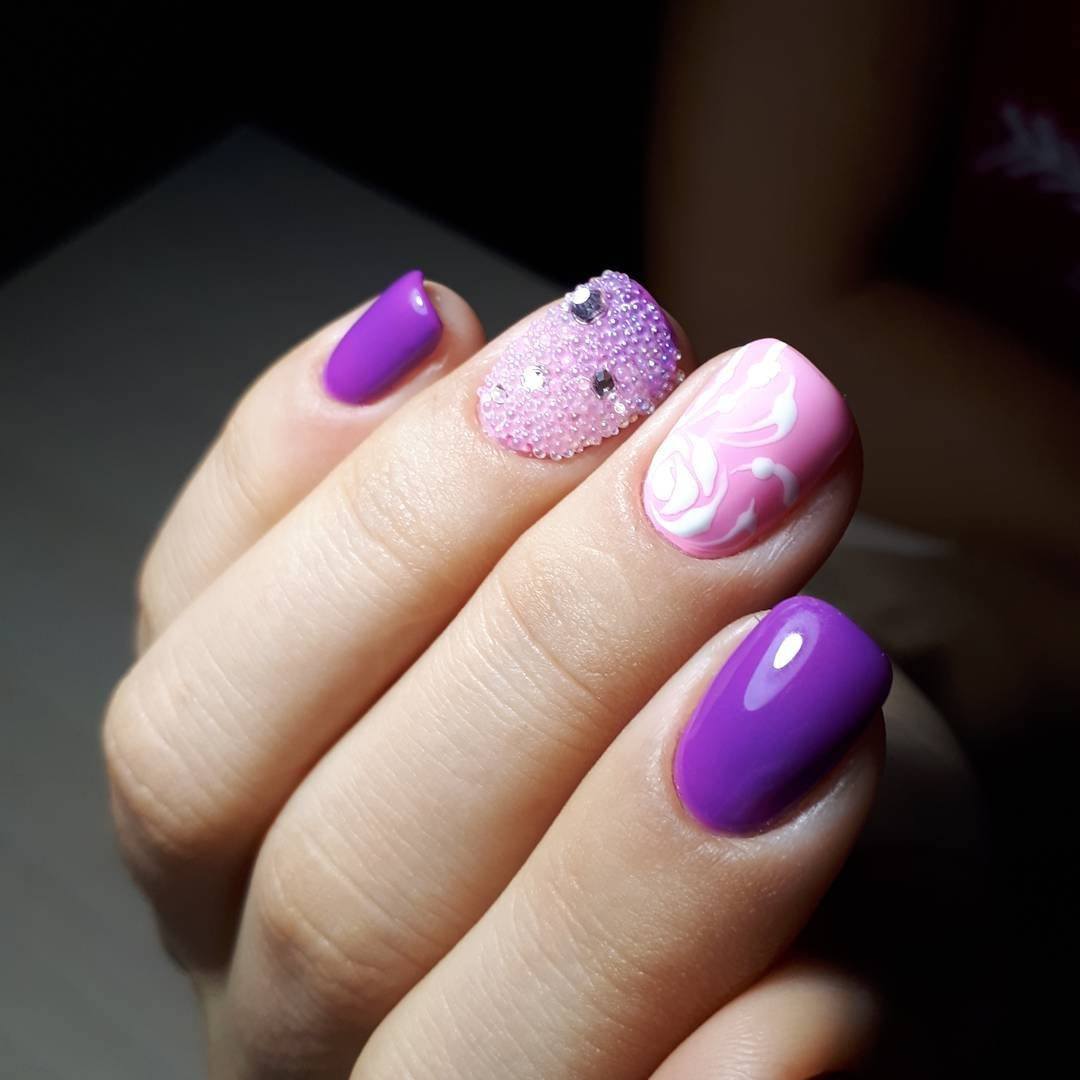 #4 Сиреневый маникюр с розовым цветом и стразами