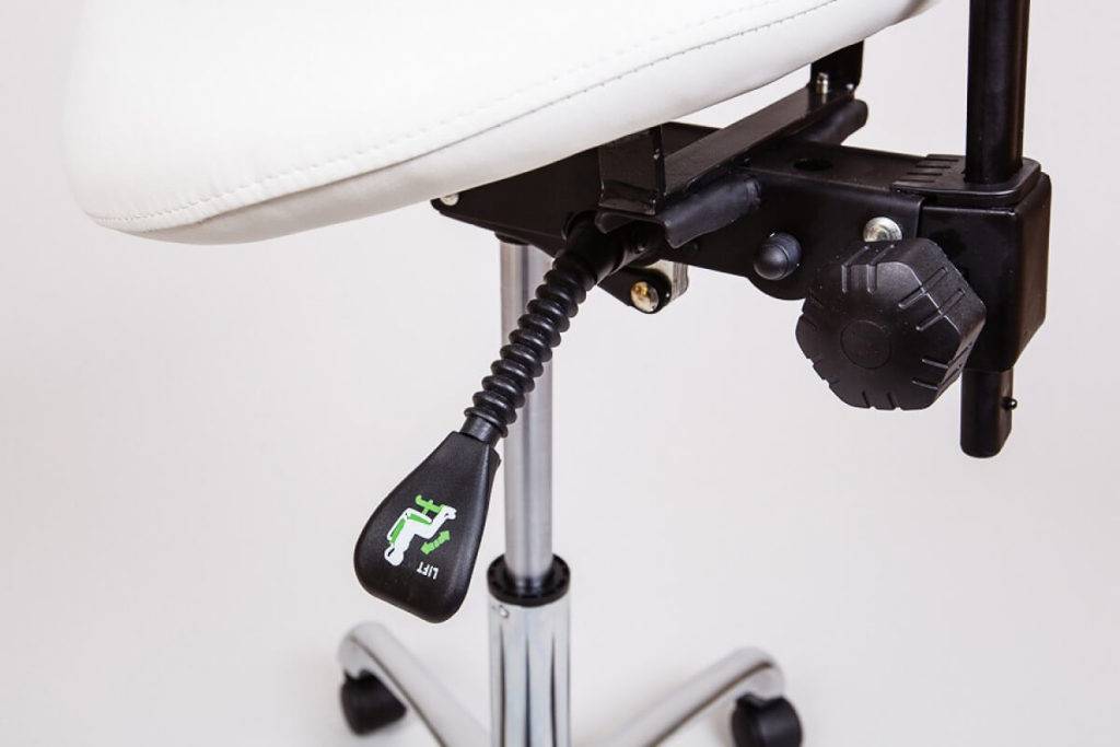 Ортопедический стул-седло включает сидение седловидной формы, опорную ножку с 5 лучами и подъемный механизм. От обычной конструкции его отличает только конфигурация.