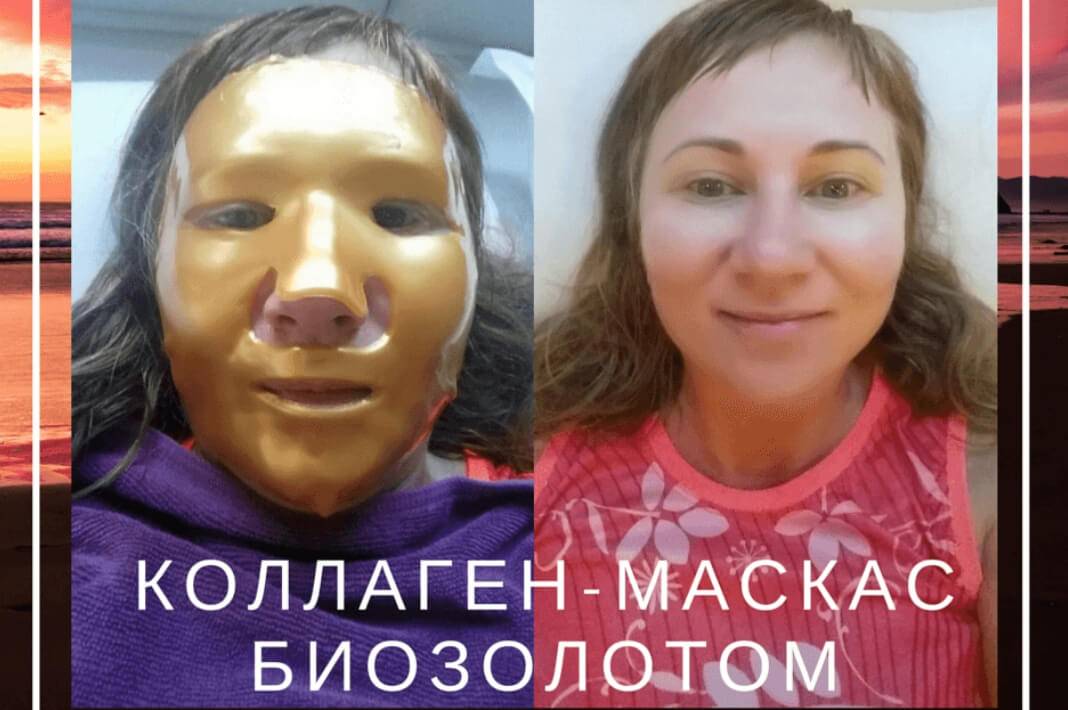 Коллагеновая маска с кристаллами биозолота содержит очищенные экстракты биологически активных натуральных компонентов и коллаген.