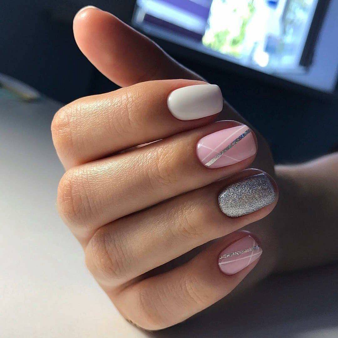Не менее интересно смотрится разноцветный маникюр в пастельных тонах с различными вариациями цветочных рисунков или геометрическими композициями, оформление с элементами «негативного пространства», лунный маникюр с блестящими лунулами или дизайн с надписями. А также, нейл-арт с инкрустацией стразами, оттисками фольги и прочие идеи, которые подчеркнут вашу индивидуальность и выбранный наряд.