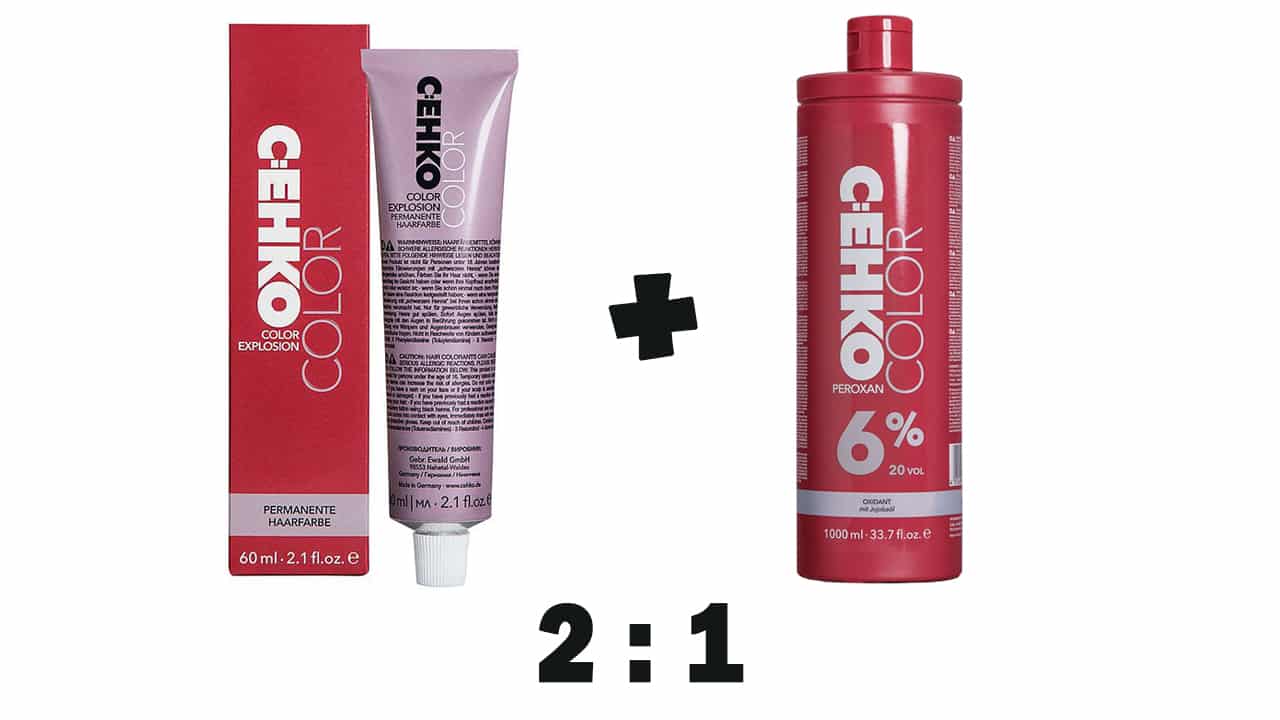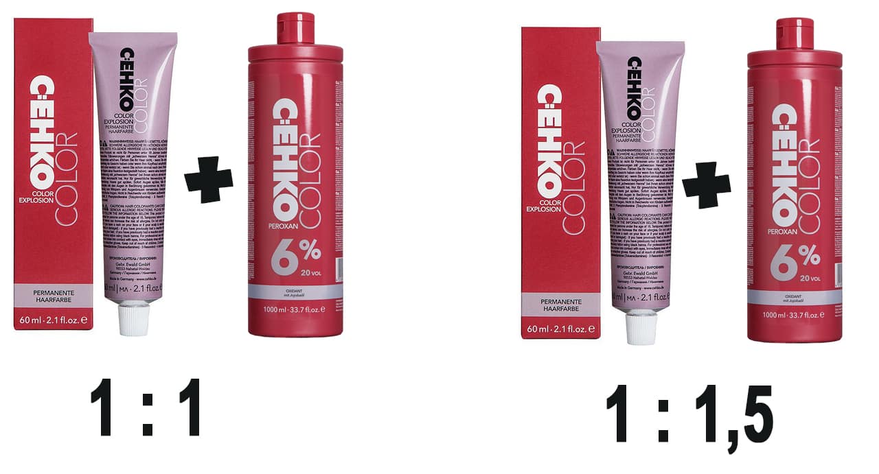 В Eugene Perma пропорции смешивания меняются: 1 часть красителя + 1 часть окислителя 3% + 2 часть шампуня.