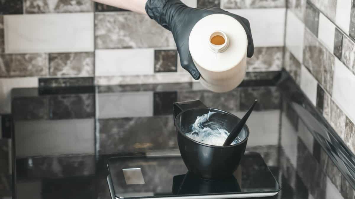 - Добавьте необходимое количество окислителя и хорошо смешайте его с красителем.