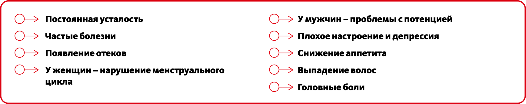 Чаще всего о нехватке минерала говорят потеря аппетита, быстрая утомляемость, слабость или плохое настроение, проблемы со слухом, памятью, периодические головные боли, сильное выпадение волос, разрушение зубов или чрезмерная сухость кожи, частые простудные или вирусные заболевания, плохая переносимость жары, одышка и болезненные ощущения в сердце.