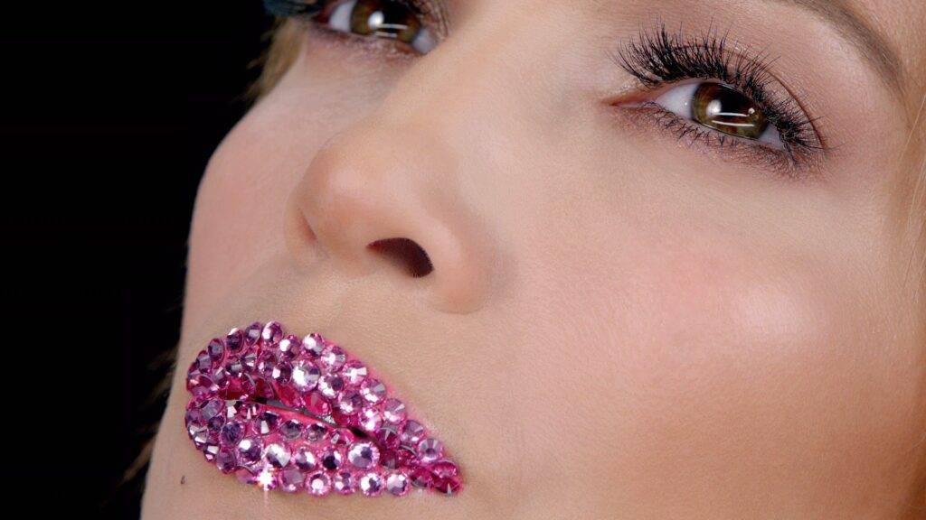 Арт-макияж губ с крупными яркими стразами разве что для эффектных Instagram-фото. Но адаптировать этот тренд к жизни очень просто. Помада с эффектом сияния поможет создать не менее яркий акцент. Мейкап глаз в этом случае можно не делать, а вот брови нужно выделить обязательно, чтобы сбалансировать образ.