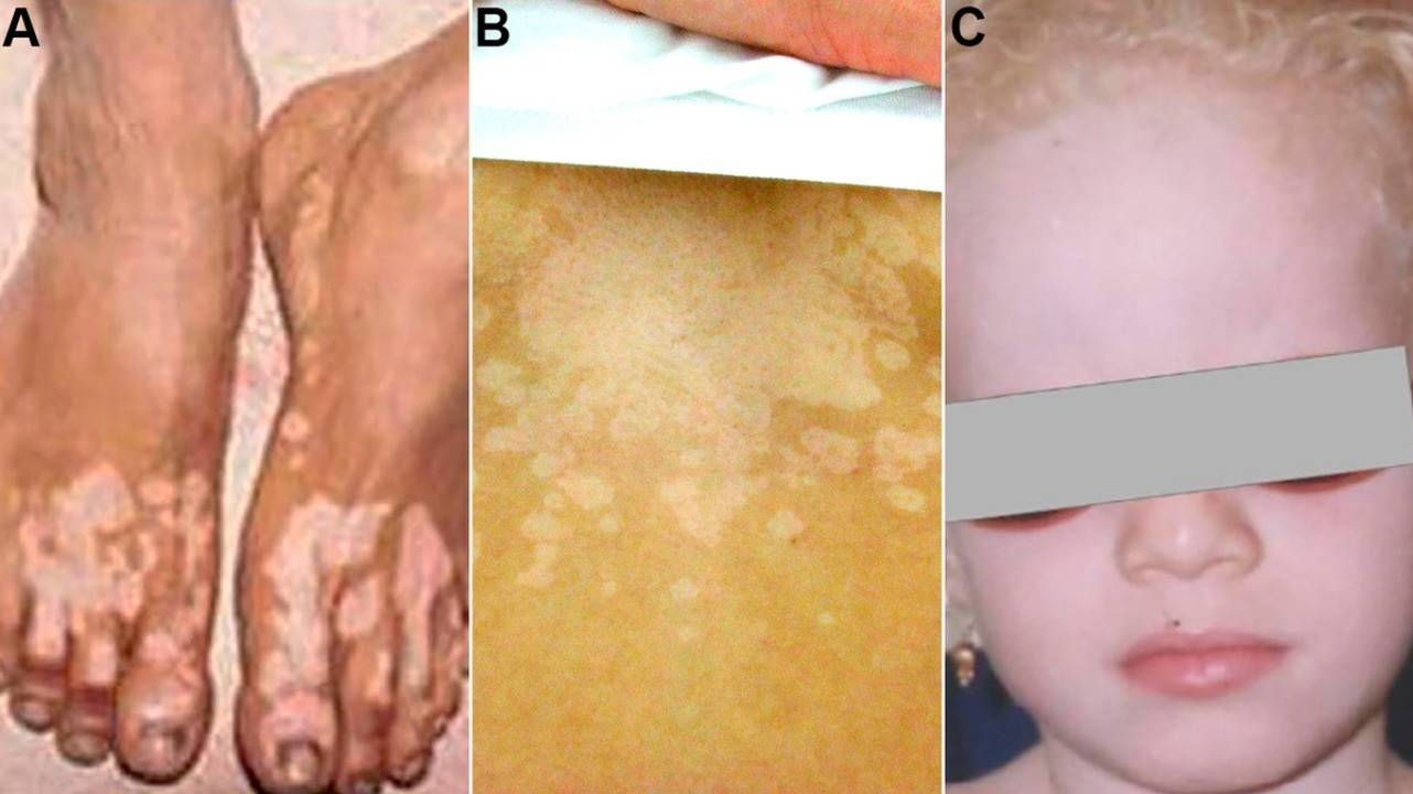 Заболевания, по симптомам похожие на витилиго. A – Химическая лейкодерма. Фото: Indian journal of dermatology / Open-i (Attribution 2.0 Generic). B – Отрубевидный (разноцветный) лишай. Фото: Sarahrosenau on Flickr.com / Wikipedia (Creative Commons Attribution-Share Alike 2.0 Generic license). C – Альбинизм. Фото: Oman journal of ophthalmology / Wikipedia (Attribution 2.0 Generic)