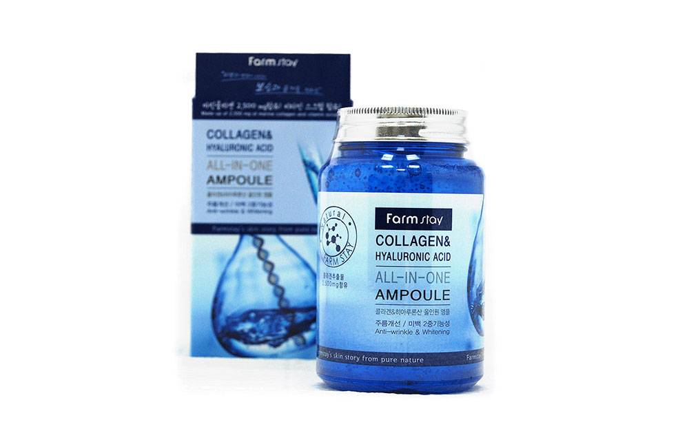 Farm Stay All-In-One Collagen & Hyaluronic Acid Ampoule – уникальная ампульная сыворотка, которая произвела настоящую революцию на рынке косметических средств. Корейская косметика без преувеличения произвела настоящий фурор, представив на суд покупателей невероятно качественные эффективные продукты. Средство помещено в привлекательную баночку синего цвета объемом в 250 мл. Кстати, данного объема хватит более чем на год активного применения средства.