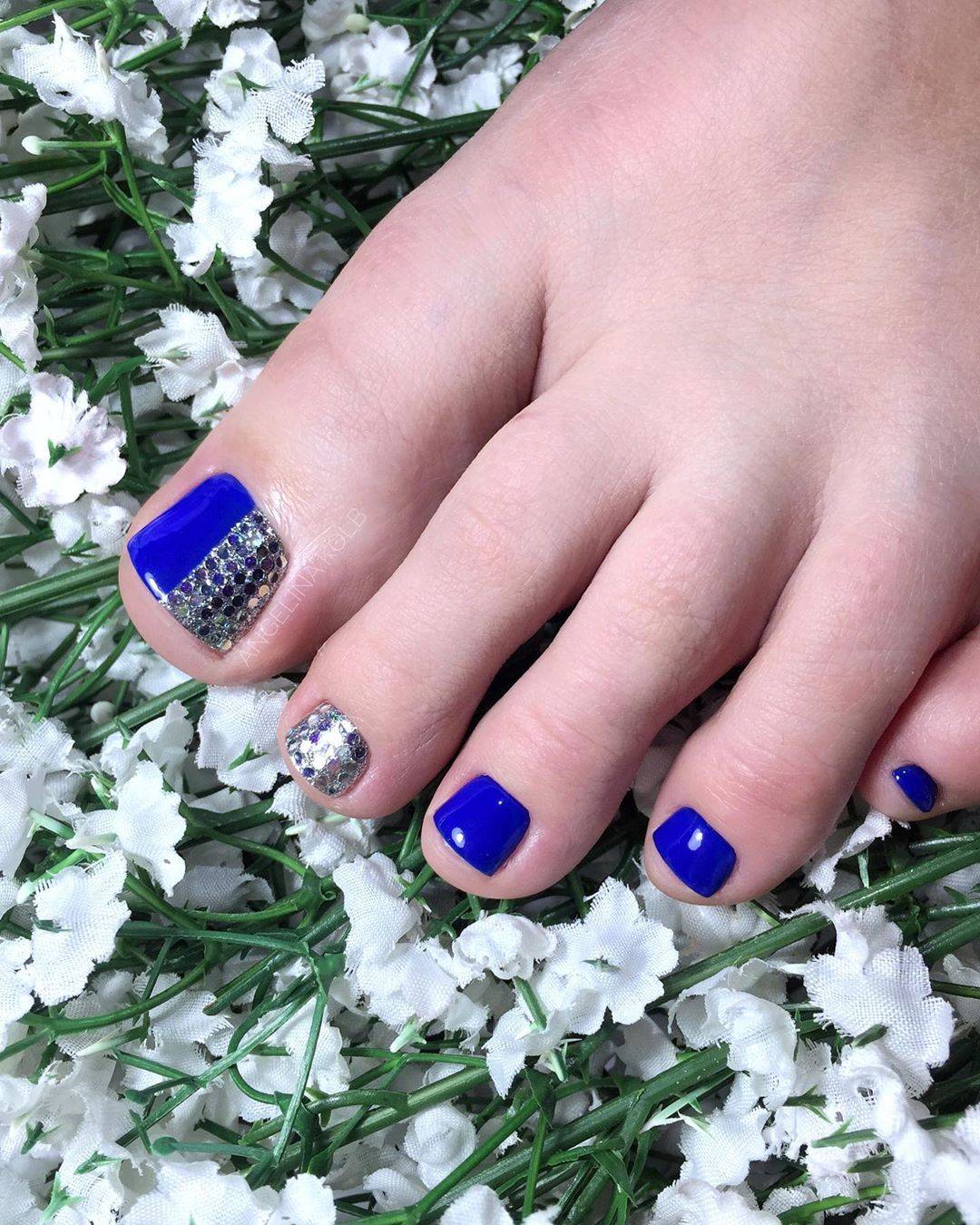 Оригинально разбавьте ваш педикюр добавлением в него страз или другого декора. Что эффектно подчеркнет глубокий синий оттенок, а также в голубом покрытии сделает ваш педикюр волшебным.