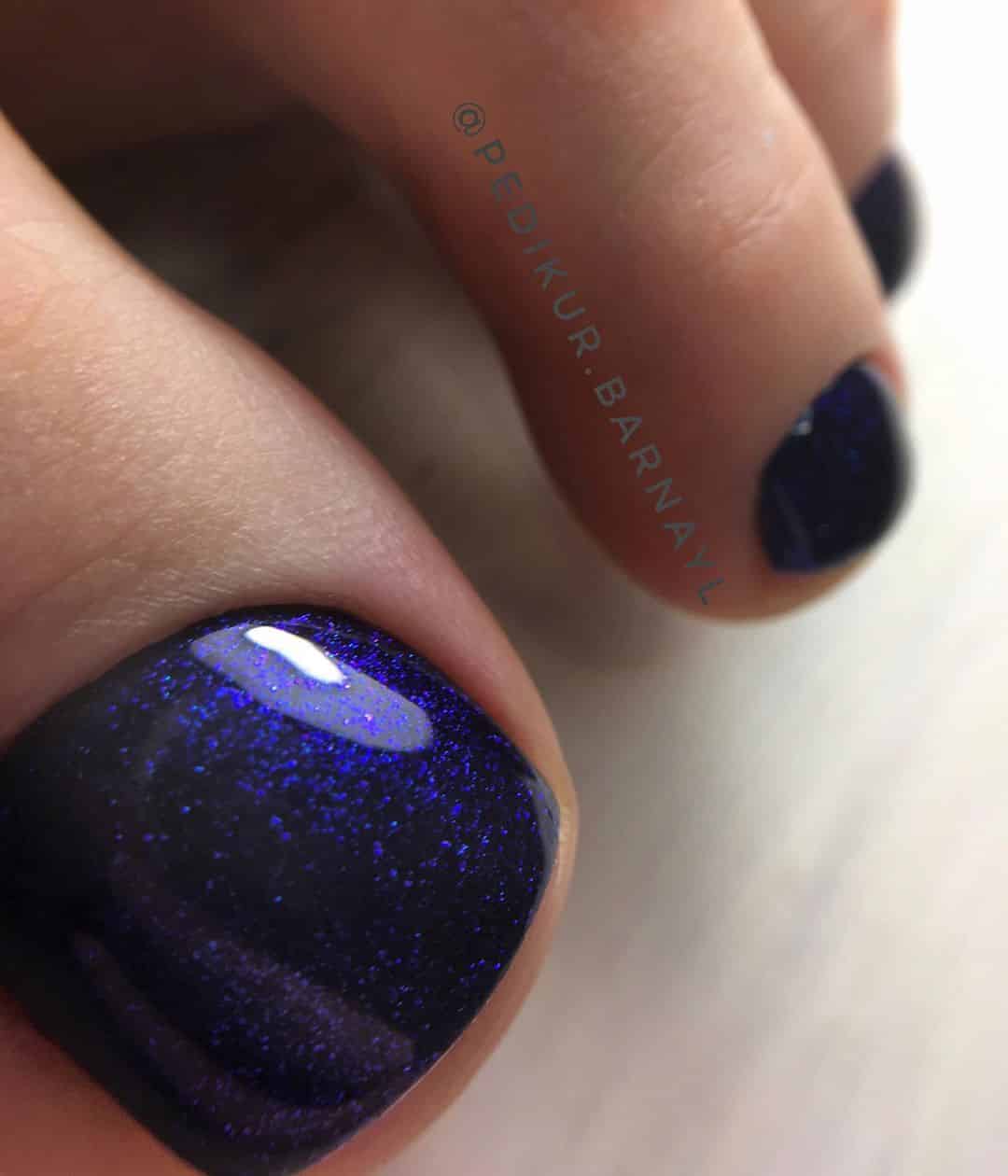 Для элегантного образа выберите синий лак темного тона, в сочетании с черными босоножками.