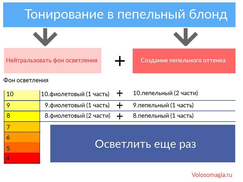 Примечание: это самые базовые формулы тонирования в пепельный оттенок блонда. Существует множество вариаций с микстонами, несколькими дополнительными оттенками и множество ньюансов, появляющихся при работе с красителями разных производителей. Но эти базовые формулы помогают не запутаться, учесть нейтрализацию желтизны и получить красивый платиновый цвет.